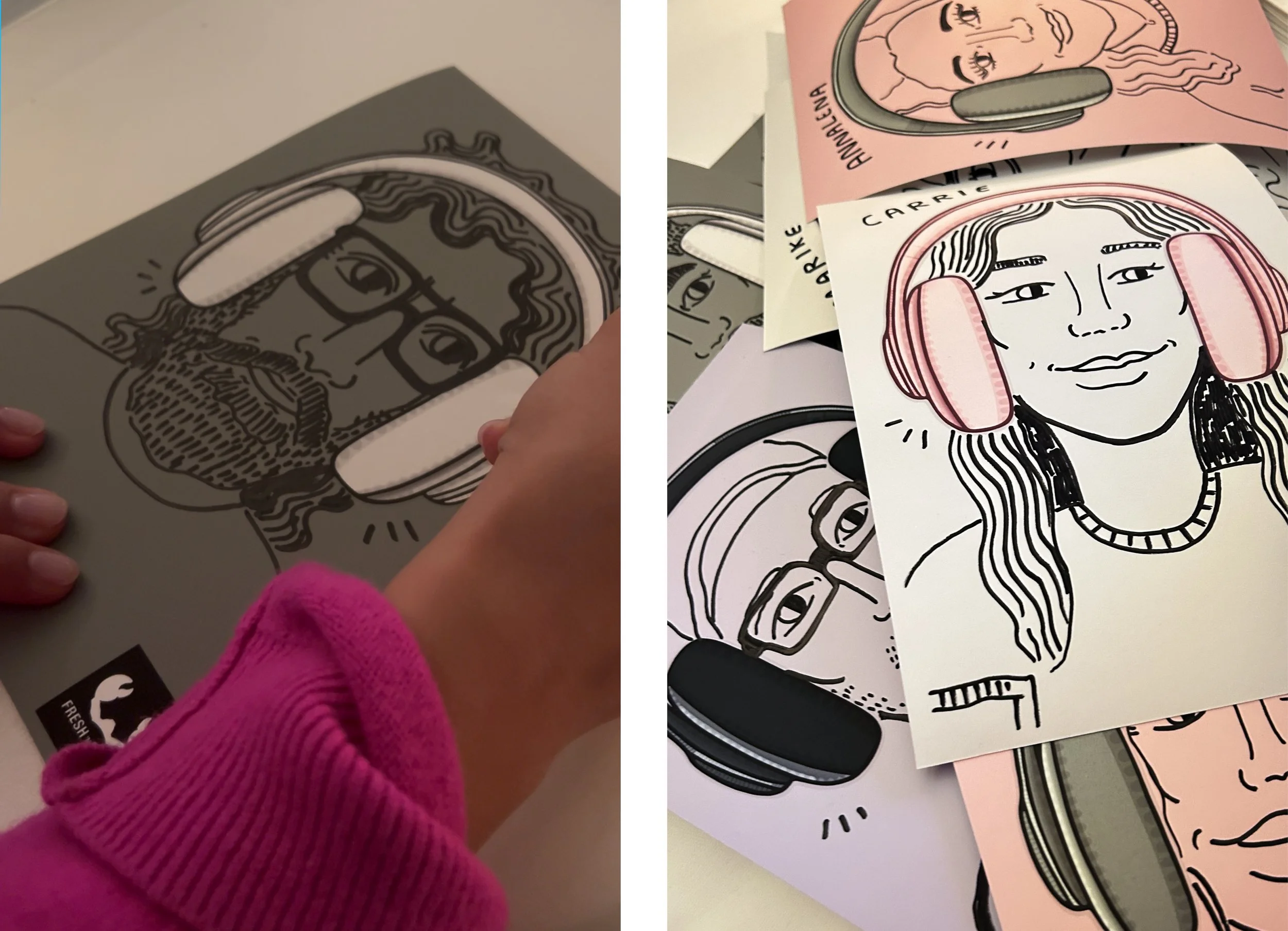 I was invited as a portrait artist for FRESH ‘N REBEL at their event. While the guests enjoyed their meals, I started drawing and at the end of the night, everyone went home with a unique portrait I had created for them. Beforehand, I prepared a digital illustration of the headphones, and live on site I added each guest’s face into it. This time, I kept it simple: only black lines meeting vibrant color.